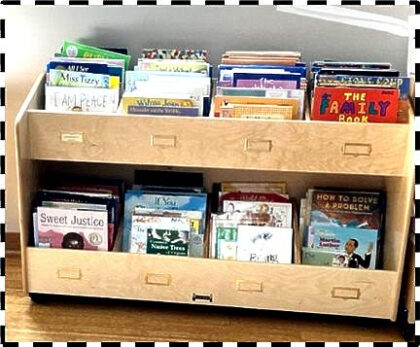 To borrow books to enjoy at home, use the clipboard and sign-out sheet to sign your name and book titles. When you return your books, cross out your name and place the book in the appropriate colored bin.
