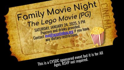 January’s Movie Night, Jan. 24, 5:00pm, is The Lego Movie (rated PG, for ages 6+). Join your friends for popcorn and the movie.