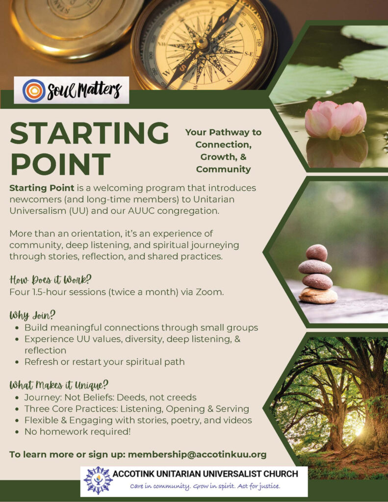 Starting Point is an opportunity to explore Unitarian Universalism while deepening your connections with other Accotinkers. These four 1.5-hour sessions offer an experience of community, deep listening, and spiritual journeying through stories and reflection. Starting Point is designed for those new to Unitarian Universalism but is open to all Accotinkers. The next session, and last offering of Starting Point in 2025, is on Tuesdays 7:00-8:30pm on Oct. 7 and 21, Nov. 4 and 18. To learn more or sign up email membership@accotinkuu.org.